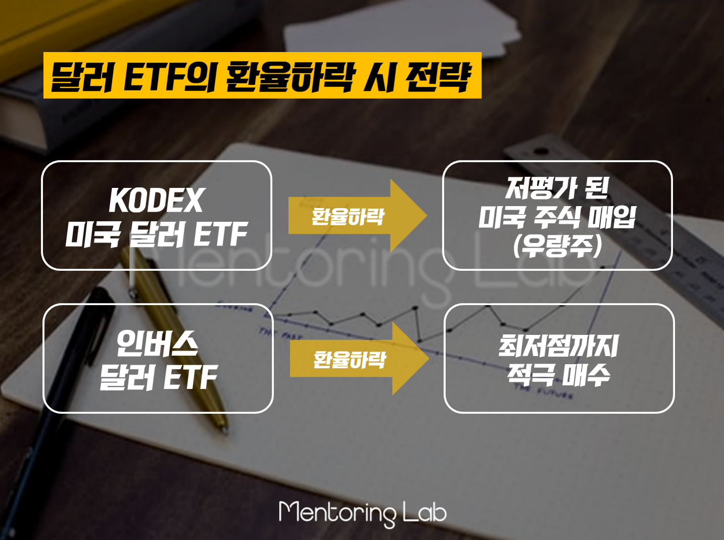 여기서 하나 알아야 할 것은 위에 언급한 일반적인 달러 ETF는 환율과 순방향으로 움직이고, 인버스 ETF 상품은 환율과 역방향으로 움직인다는 점입니다. 그러니 지금처럼 환율이 떨어지는 경우에는 어떻게 해야 할까요? 조금만 생각해보면 두 금융상품에서 해야하는 전략이 나오실 겁니다.