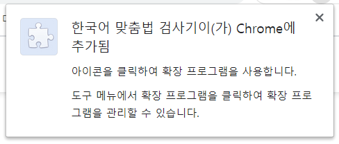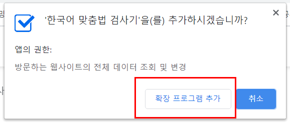 추가버튼을 누르면 크롬 환경에서 확장 프로그램으로 한국어 맞춤법 검사기를 확장 프로그램으로 추가할 것인지 한 번 더 물어봅니다. 아마도 개발환경을 바꾸는 것이기 때문에 신중을 기하는 것 같습니다. 자신 있게 확장 프로그램 추가 버튼을 눌러줍니다.