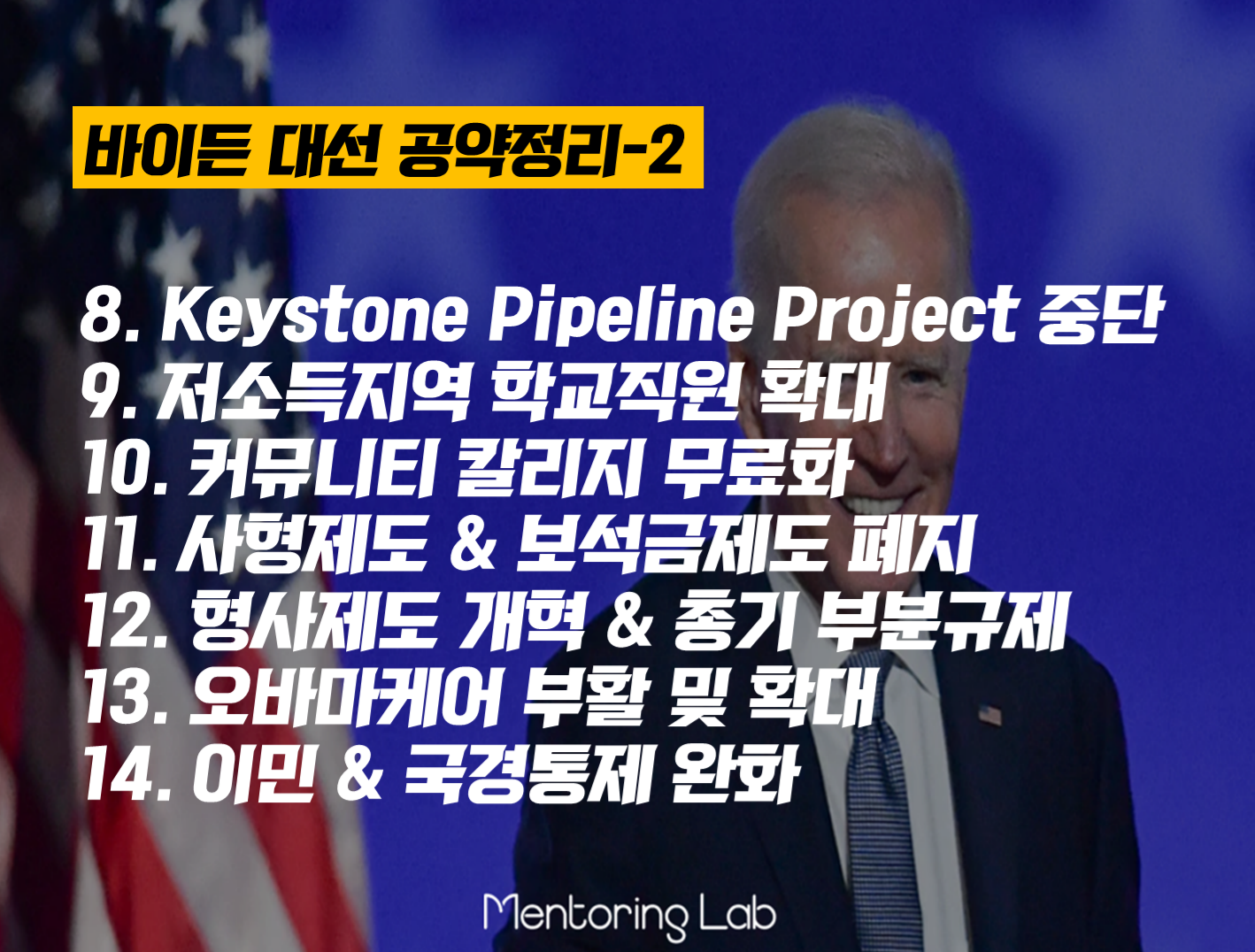 만약 바이든이 당선된다면 외교정책의 불리(Bully)로 불리던 트럼프에 비해서 너무나 다른 방향의 미국의 모습이 보여질 듯합니다. 정책에 정답은 없겠지만 그래도 위에 언급되어 있는 바이든 대선후보의 28가지 공약들과 관련 있는 국내의 정세와 주가정보 정도는 알고 있어야겠죠?