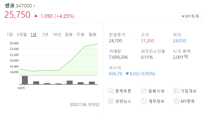 '친환경'이라는 키워드가 등장하면 어김없이 주가가 올랐던 주식들이 있는데 그 중에서도 수출, 바이오, 탄소 등의 키워드와 교차분석을 해보니 6개 정도의 종목이 나왔습니다. 실제로 '센코(347000)' 같은 경우는 바이든 키워드의 트래픽 상승률과 엇비슷하게 많이 올랐네요.