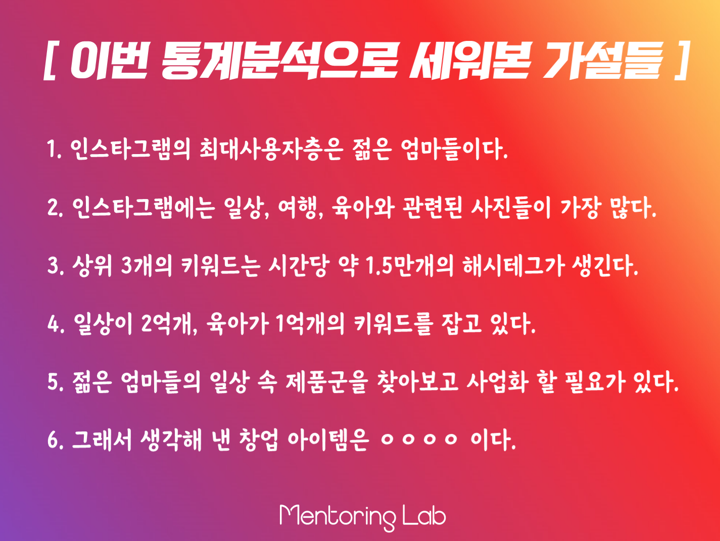 마케팅의 가장 기본적인 본질은 시장의 트렌드를 읽어내는 것입니다. 해시테그를 그저 개수로만 파악해놓지 말고 이런 데이터를 어떻게 분석적으로 해석해야 하는지가 더 중요하겠죠^^? 작은 회사지만 마케팅회사를 운영해본 경험으로 위의 인스타그램 1000만뷰 이상의 해시테그 결과를 놓고 정리해보면 다음과 같은 가설명제들을 세워볼 수 있습니다.