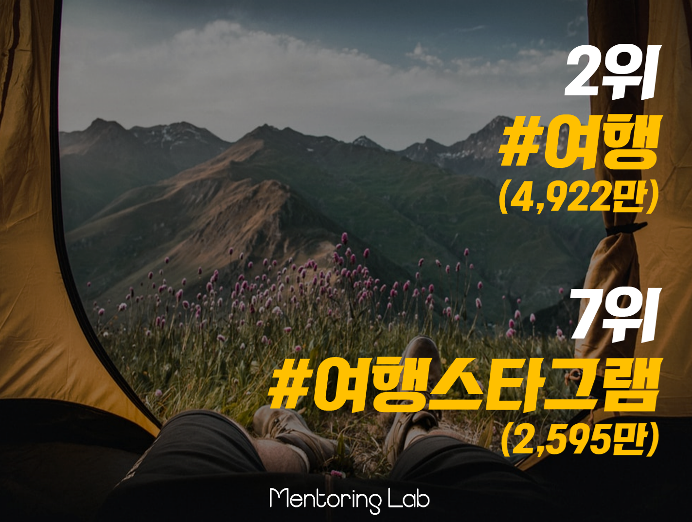 인스타그램하면 빠질 수 없는 것이 바로 '여행'이 아닐까 싶습니다. 그래서인지 2위와 7위 모두에 #여행 해시테그가 랭크되었네요. 7위는 #여행스타그램으로 2,595만개, 2위는 #여행 으로 4,922개의 해시테그가 남겨져 있습니다.