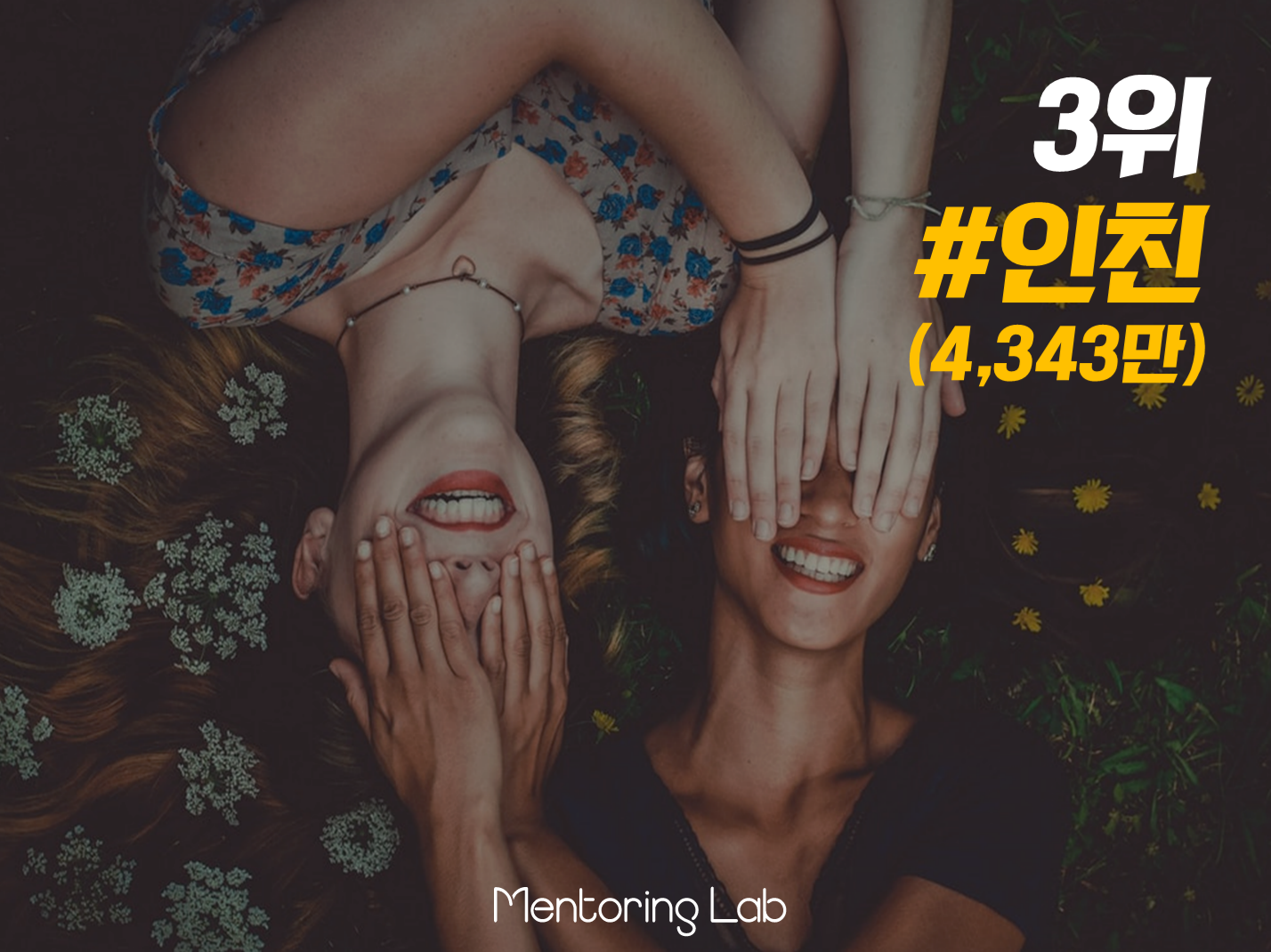 3위는 #인친 해시테그가 차지했습니다. 트렌디한 SNS플랫폼답게 줄임말이 상위권에 랭크되었네요. 인친은 인스타그램친구를 줄여 부르는 말입니다. 무려 4,343만개의 해시테그를 가지고 있습니다. 한 사람이 반복적으로 해시테그를 올릴 수 있다고 하더라도 이는 실로 엄청난 숫자임에는 틀림이 없습니다. 이제는 현대인들이 오프라인에서의 관계만큼 온라인에서의 관계를 정식적인(?) 인간관계로 인식하기 시작했다는 심리학자들의 말에 힘이 실리는 이유입니다.