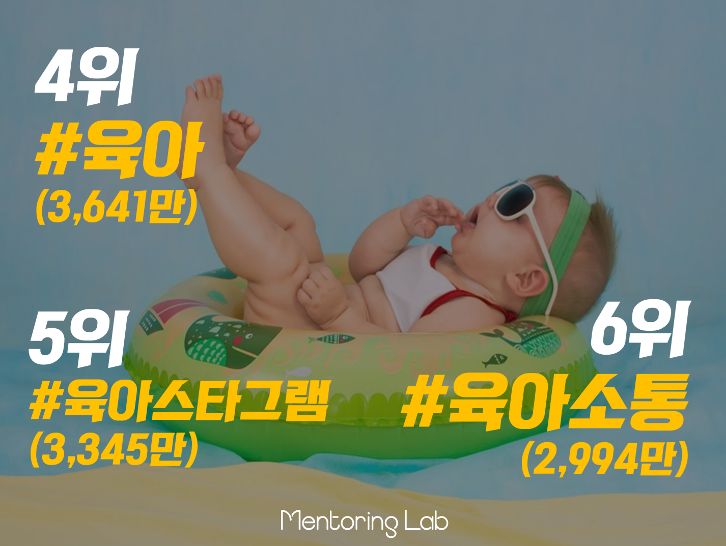4위부터 6위까지는 모든 '육아'와 관련된 해시테그입니다. 6위는 #육아소통이 총 2,994만, 5위는 3,345만개의 #육아스타그램이, 4위는 이 둘을 포함하는 키워드는 #육아가 3,641개로 4위에 랭크되었습니다.
