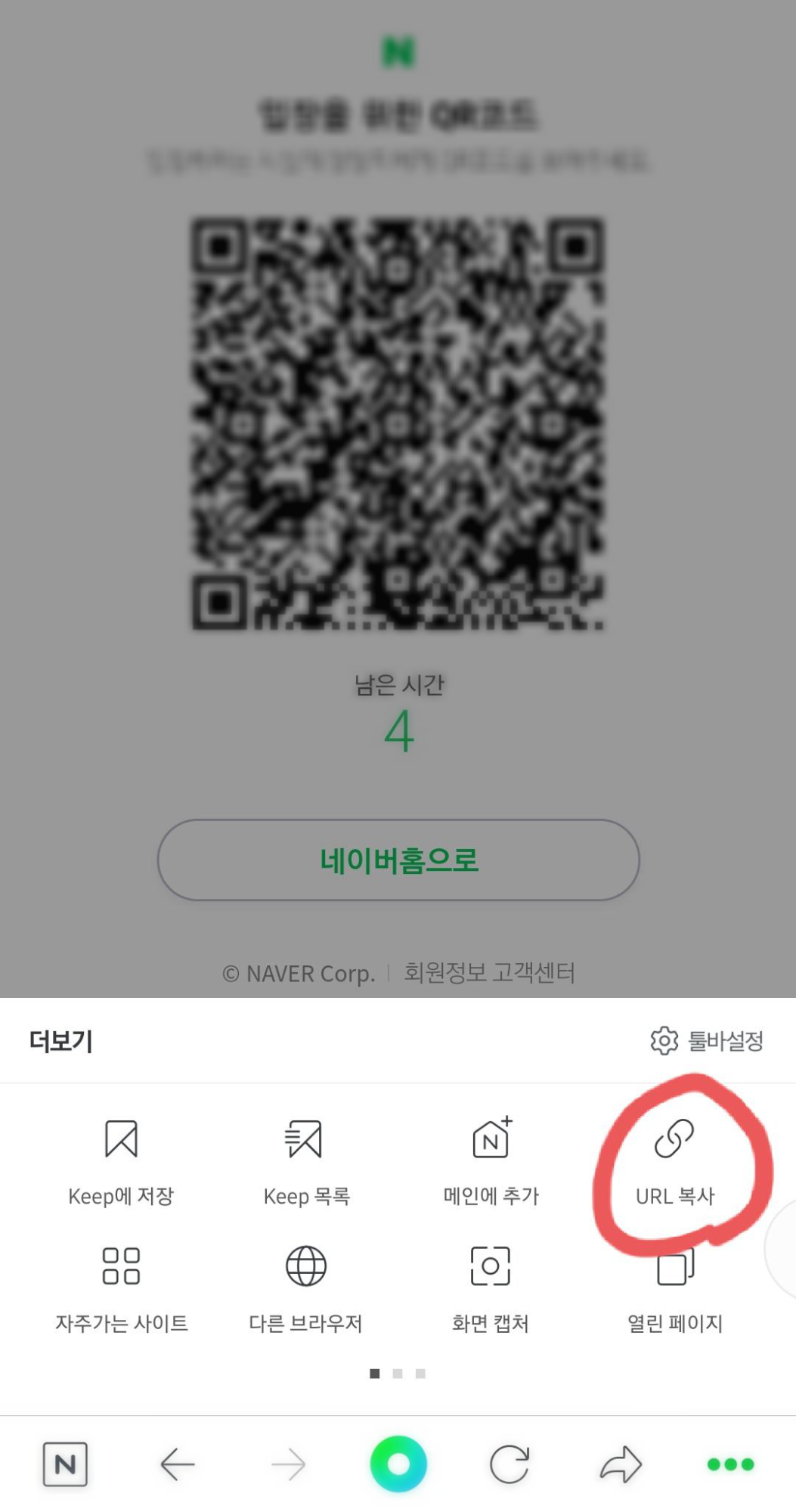 2. QR코드 체크인 페이지에서 오른쪽 하단 더보기 - URL주소 복사
