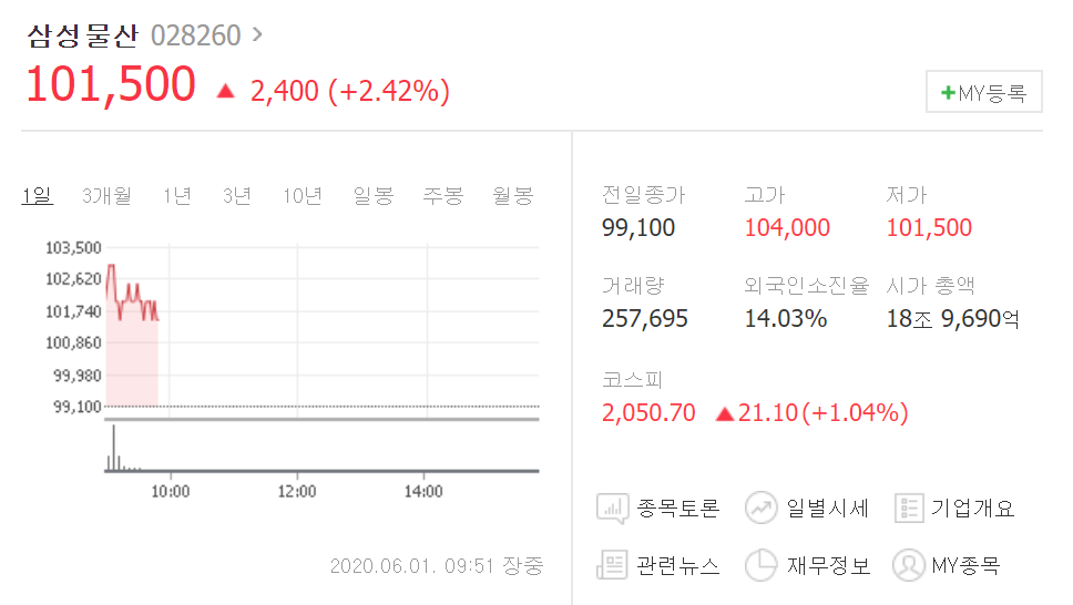 그리고 수익실현으로 확보한 현금을 나는 '삼성물산(028260)'에 투자했다.