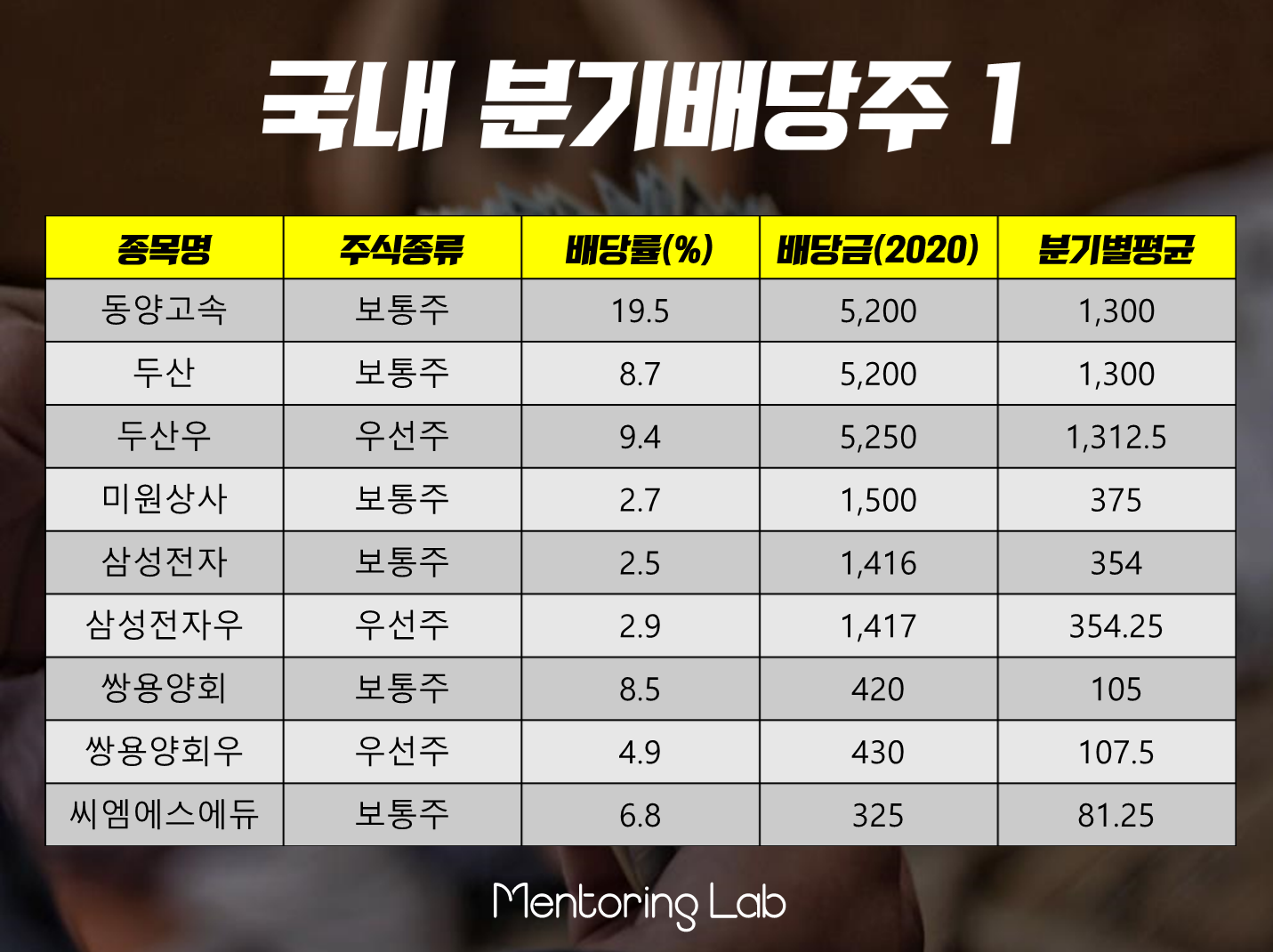 다음 포스팅에서는 위 기업들의 배당기준일도 한 번 정리해보면 좋을 듯 하네요.