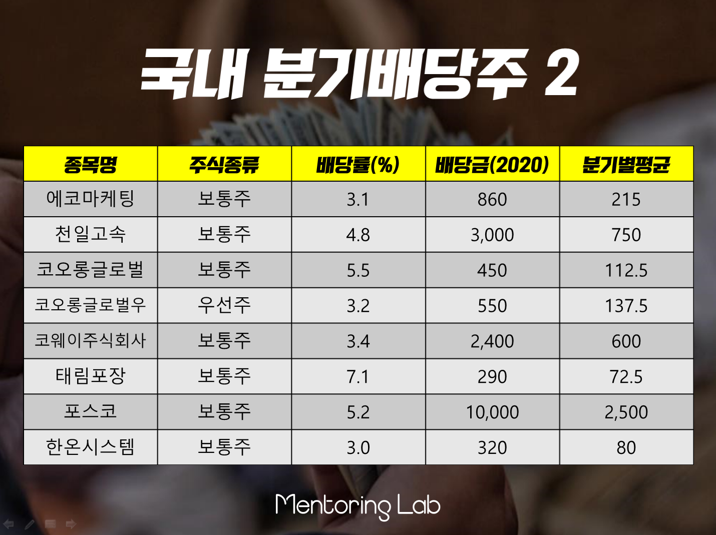 위의 표를 살펴보시면 분기별로 주당 받을 수 있는 배당가격의 평균치가 나옵니다. 기업의 분기별 실적에 따라 조금씩 차이가 나니 평균치를 보면서 배당주를 매수하는 전략이 속 편합니다.