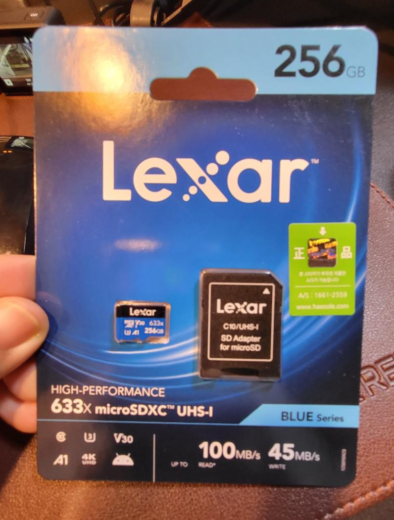 바로 이 녀석 '마이크로 SD카드 Lexar 256G'입니다. 보통 마이크로 SD카드 제품에는 엑센이나 삼성전자에서 출시되는 제품들이 있는데, 삼성전자는 너무 비싸고 엑센은 제가 몇 번 저장오류로 파일을 날린 경험이 있어서 안 쓰고 있습니다. 그래서 그 이후로부터는 렉사 마이크로 SD카드 Lexar 256G를 쓰고 있죠.