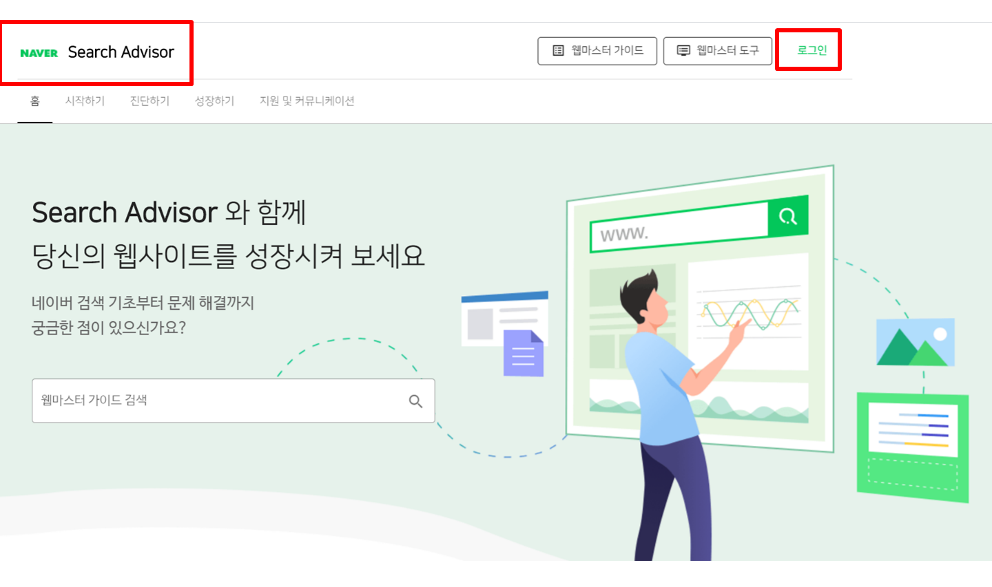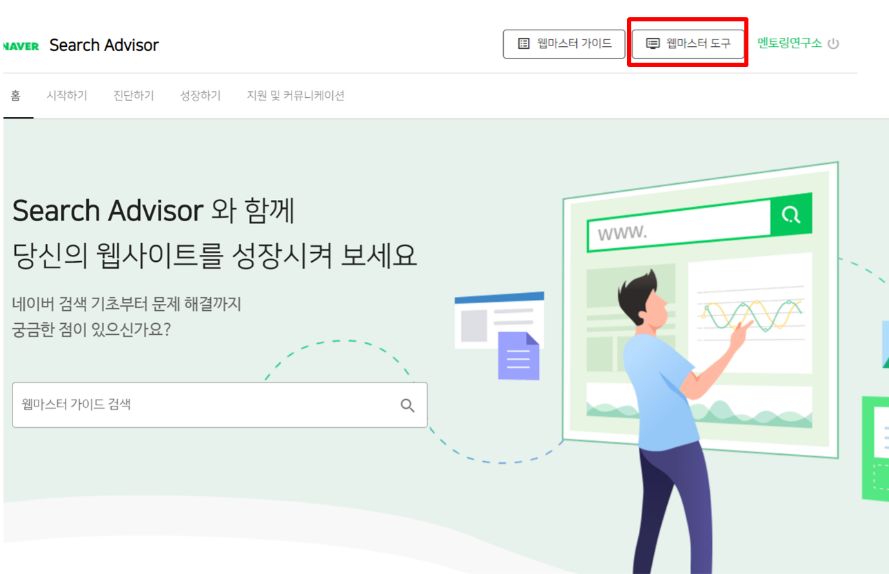 예전에는 네이버 웹마스터도구라는 웹페이지로 존재했었는데 이제는 또 네이버가 업데이트가 되어서 '네이버 서치어드바이저(Search Advisor)'에서 웹마스터도구에 내 블로그를 등록할 수 있다.