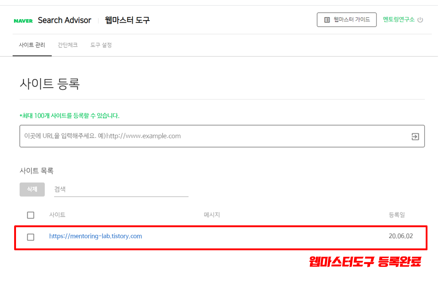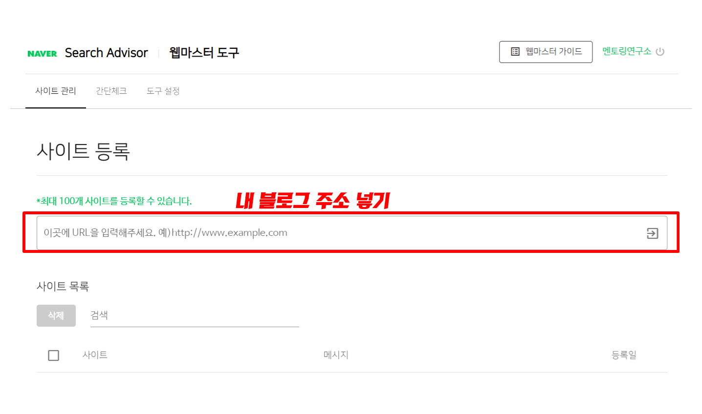 3. 사이트 등록란에 내 블로그 주소를 복사해서 붙여넣기