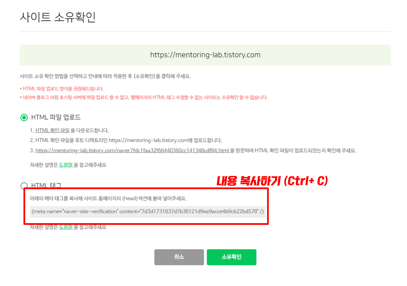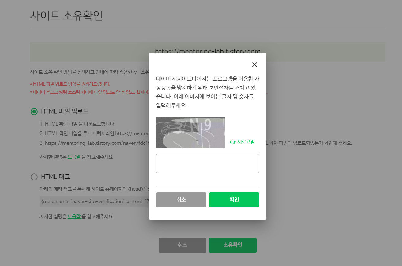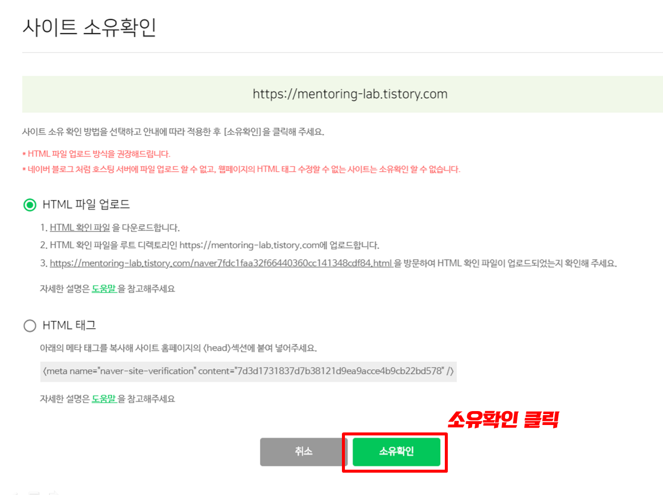 아 그리고 캡처화면에는 HTML파일 업로드가 체크되어 있는데, 화면 밑에 있는 HTML테그를 클릭해주시고 소유확인을 눌러야 정상적인 확인으로 등록된다.