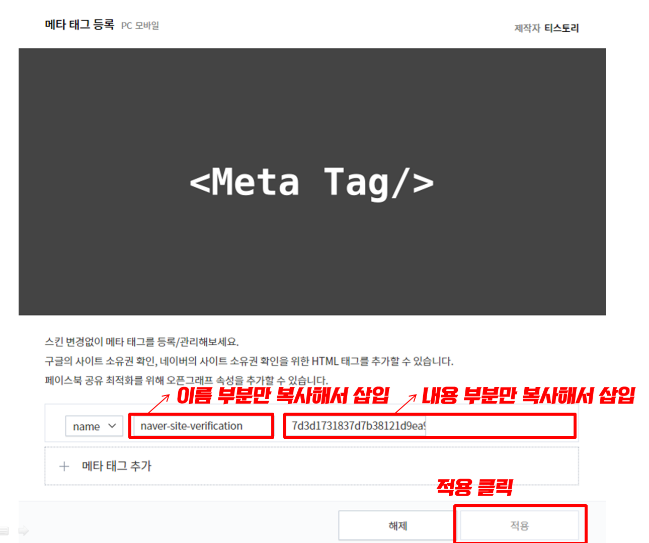 예전에는 <meta name> 코드 전체를 삽입했었는데, 지금은 이름 부분과 내용 부분을 별도로 삽입을 해줘야 하니 이 부분만 신경쓰면 될 듯 하다. 어려울 것 없다. 그냥 복사해서 붙여넣기를 2번 하면 된다. 이름 부분과 내용 부분을 정상적으로 삽입하면 '적용' 버튼이 활성화 되고 클릭해주면 된다.