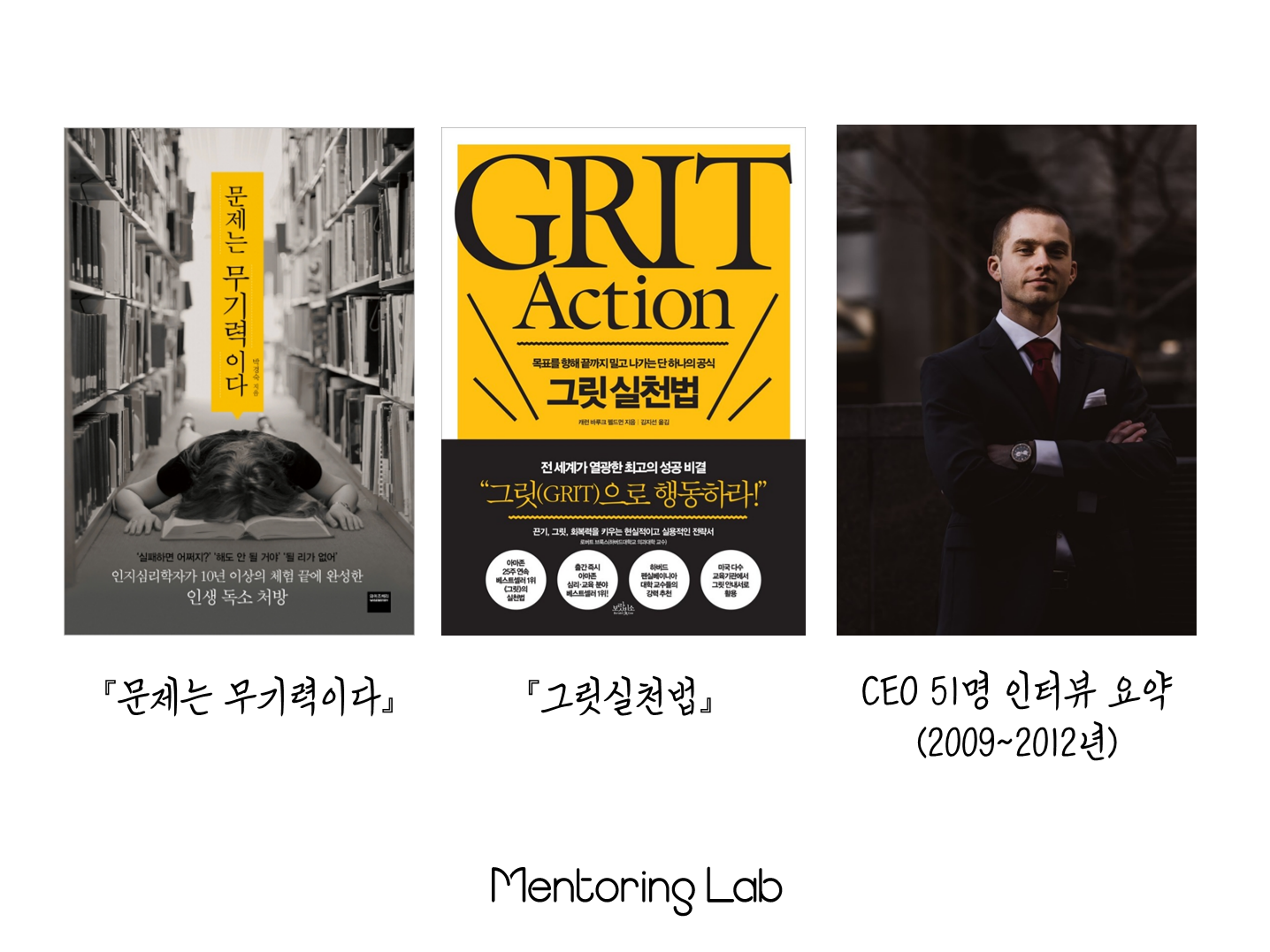 이 질문에 대한 해답을 얻기 위해 저는 ‘문제는 무기력이다’, ‘그릿’ 2권의 책을 참고했고, 나머지는 제가 직접 인터뷰한 51명의 CEO의 이야기를 요약했습니다.
