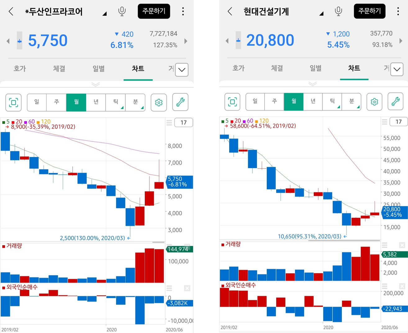 이 두 회사의 공통점은 우리가 흔히 알고 있는 '굴삭기'를 만드는 기업입니다. 그 중에서도 중국을 대상으로 꾸준히 수출을 기록해서 중국 내 시장 점유율 10위권 안에도 들 정도였죠. 그랬던 이 두개의 기업이 코로나19의 여파로 바닥을 찍었다가 역대 최고의 판매량을 기록하기 시작했습니다.