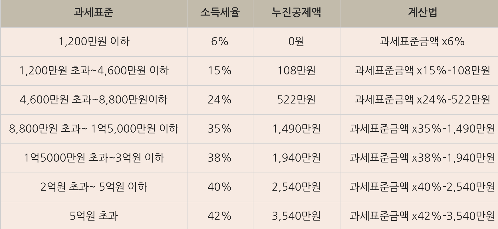이쯤에서 하나 확인하고 가야할 것은 ‘과세표준구간’이다. 앞서 말한 ‘매출-비용=순수익’에서 순수익에 해당하는 구간에 따라 세금의 비율이 달라지기 때문이다.
